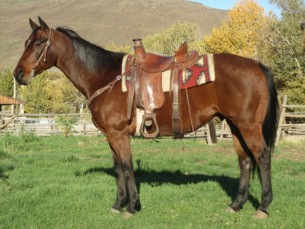 Very pretty head, big eye, elegant neck, big hip, good big dark-footed. He has been ridden and used on a ranch all his life, doctored cattle and trail ridden a lot, so he's seen timber and wildlife and is a real cool head. Very laid back, gentle, grounded individual. With good cow- horse breeding, he's keen and alert and never misses anything, cattle or wildlife; on-point like a bird dog, but no spook, very reliable. Willingly steps out on a loose rein and will travel that way all day. He's ideal for the avid trail rider or one wanting that all-around family horse to do it all on. Whether it's a mountain trail, forging a river, or cutting off a cow, here is a first class "been there-done that" fun horse to ride. Very comfortable as he is extremely smooth and has our signature WHR lovely neck rein. With formal cow-horse training as young horse, he rides with a refined way about him, slow, smooth hobby-horse lope on a loose rein or collected. They don't get any better for versatile use here.